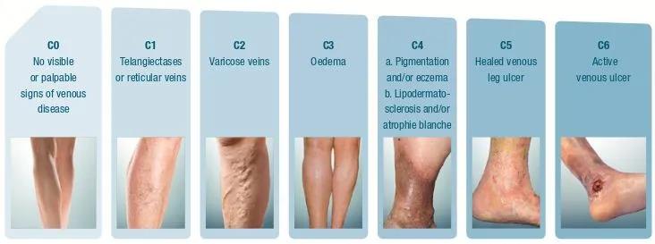 静脉曲张、色素沉着、湿疹、脂性硬皮病、溃疡。