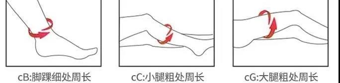 测量方法:用软尺量出穿者腿部的三个部位尺寸(cm):足踝(脚脖子最细处)周长、小腿肚最大周长和大腿根部周长,确定合适的尺码。